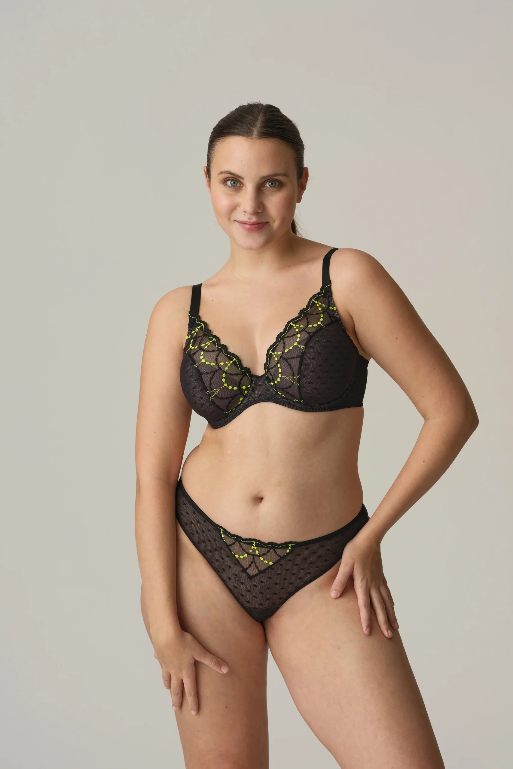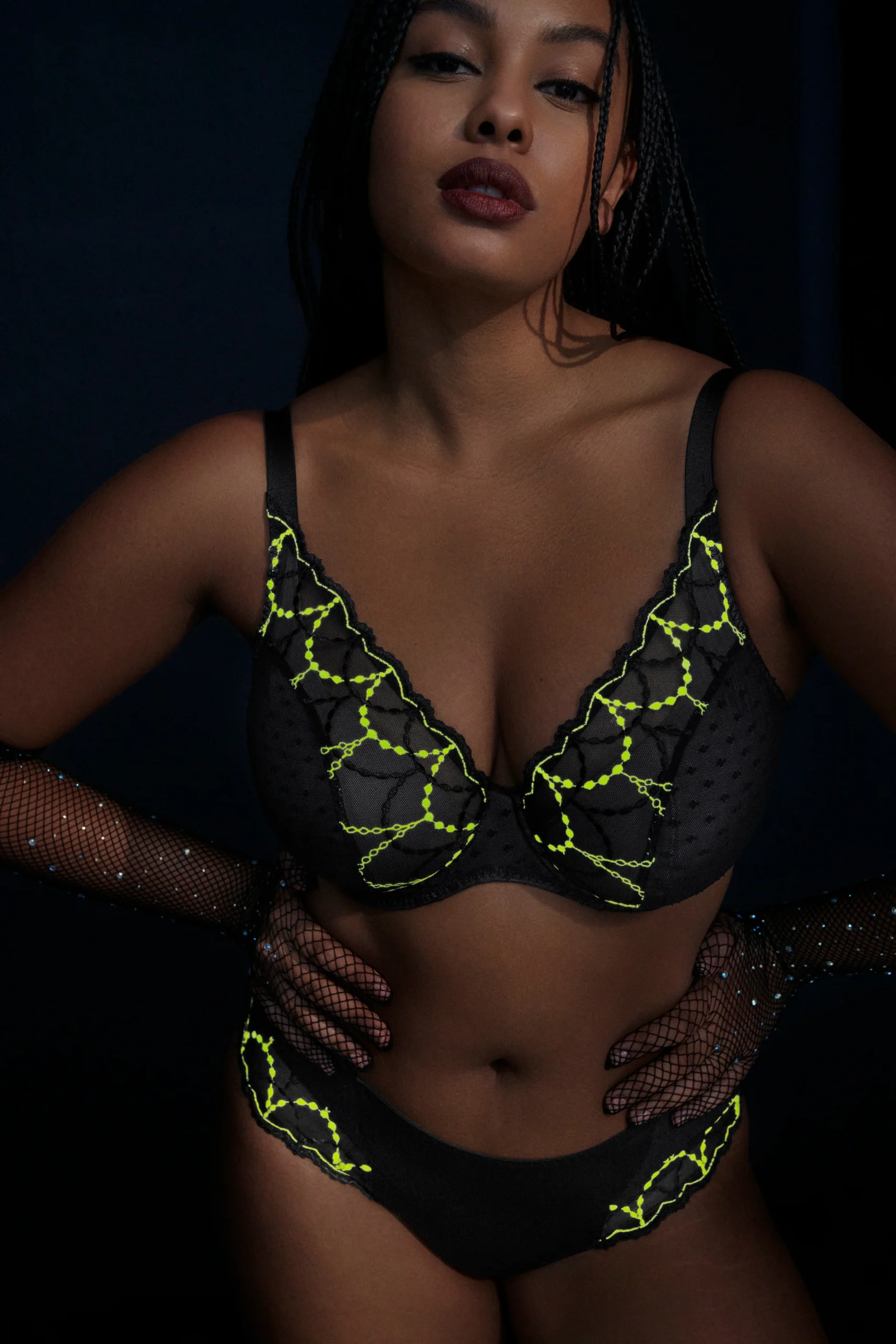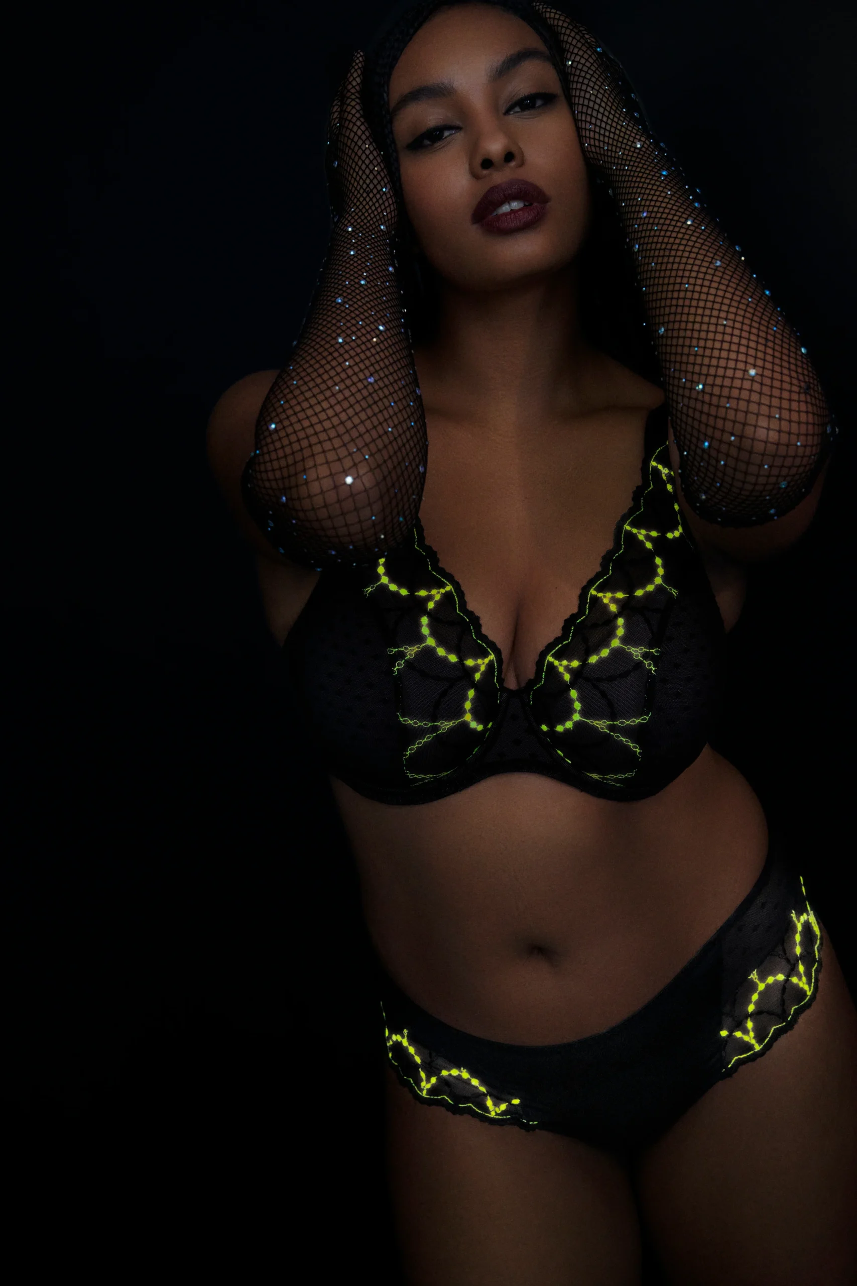 PrimaDonna Twist Tepito mezcla elementos de lencería atemporales y modernos en un look de alta costura. Lencería de fiesta exclusiva con un ajuste excelente para todos los días. Dark Glow es un bordado negro con detalles de neón amarillo y un divertido efecto que brilla en la oscuridad. Un lúdico toque noventero que se ilumina sutilmente en la oscuridad, pero que es completamente invisible bajo la ropa.