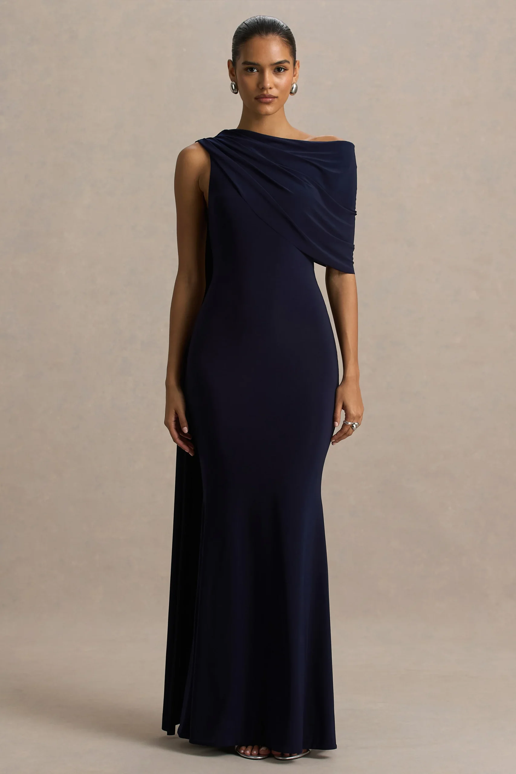 Irradia elegancia con Tiana, un vestido que combina a la perfección modernidad con glamour atemporal. Confeccionado en nuestro premium stretch jersey en un profundo tono azul marino, este diseño de largo maxi moldea y favorece cada curva. El escote asimétrico aporta un toque llamativo, realzado por un panel drapeado que cae suavemente sobre el hombro. Un dramático detalle de banda se extiende desde el hombro hasta el suelo, añadiendo fluidez y un aire de alta costura. Tiana es la encarnación de la sofisticación para noches inolvidables.