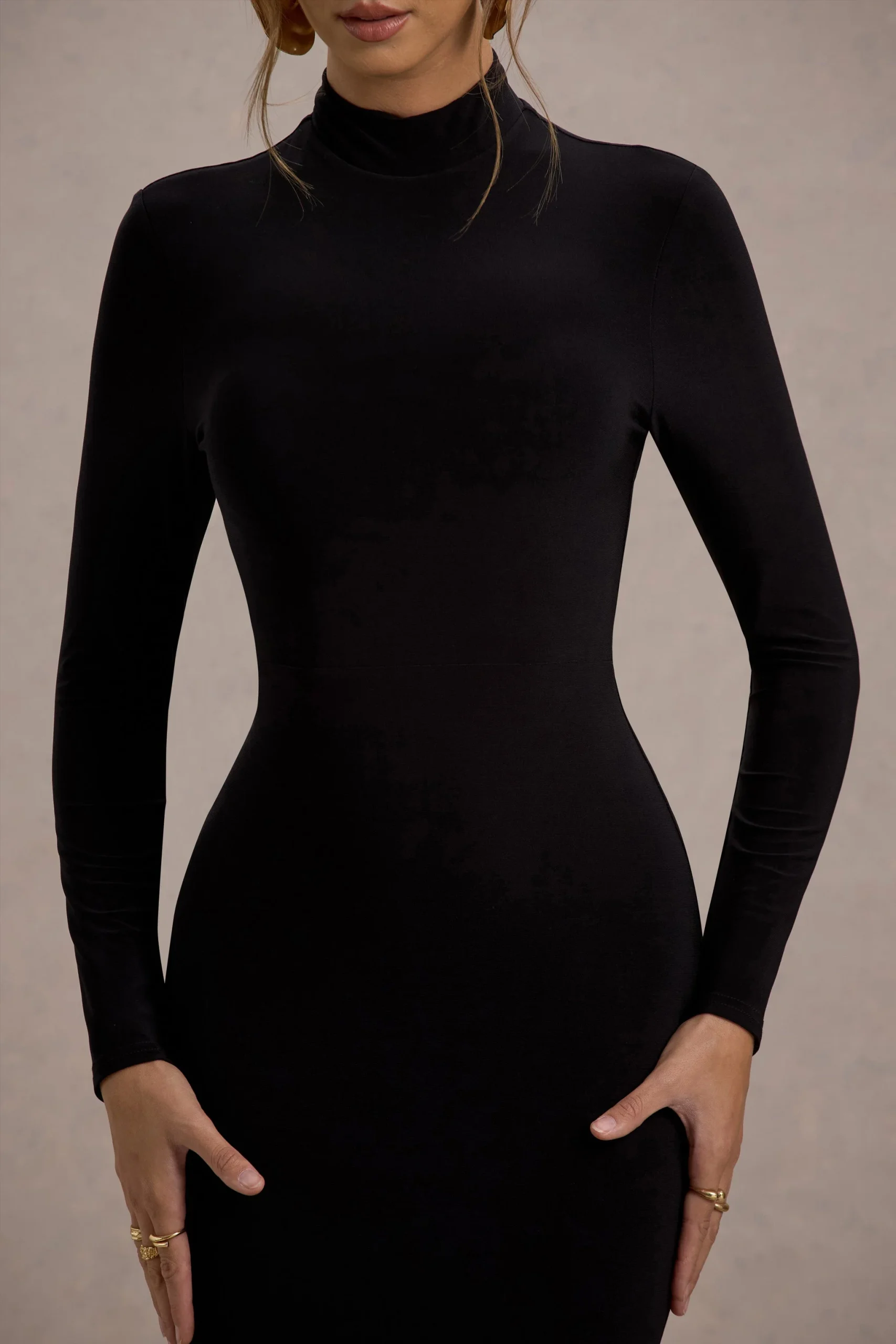 Crea un armario de básicos elevados comenzando con Tova. Confeccionado con un jersey premium que realza las curvas, esta pieza ajustada al cuerpo presenta un discreto escote alto, mangas largas y una falda de cola de pez fluida. Complementa su clásico tono negro con algunos accesorios brillantes en tu próximo evento.