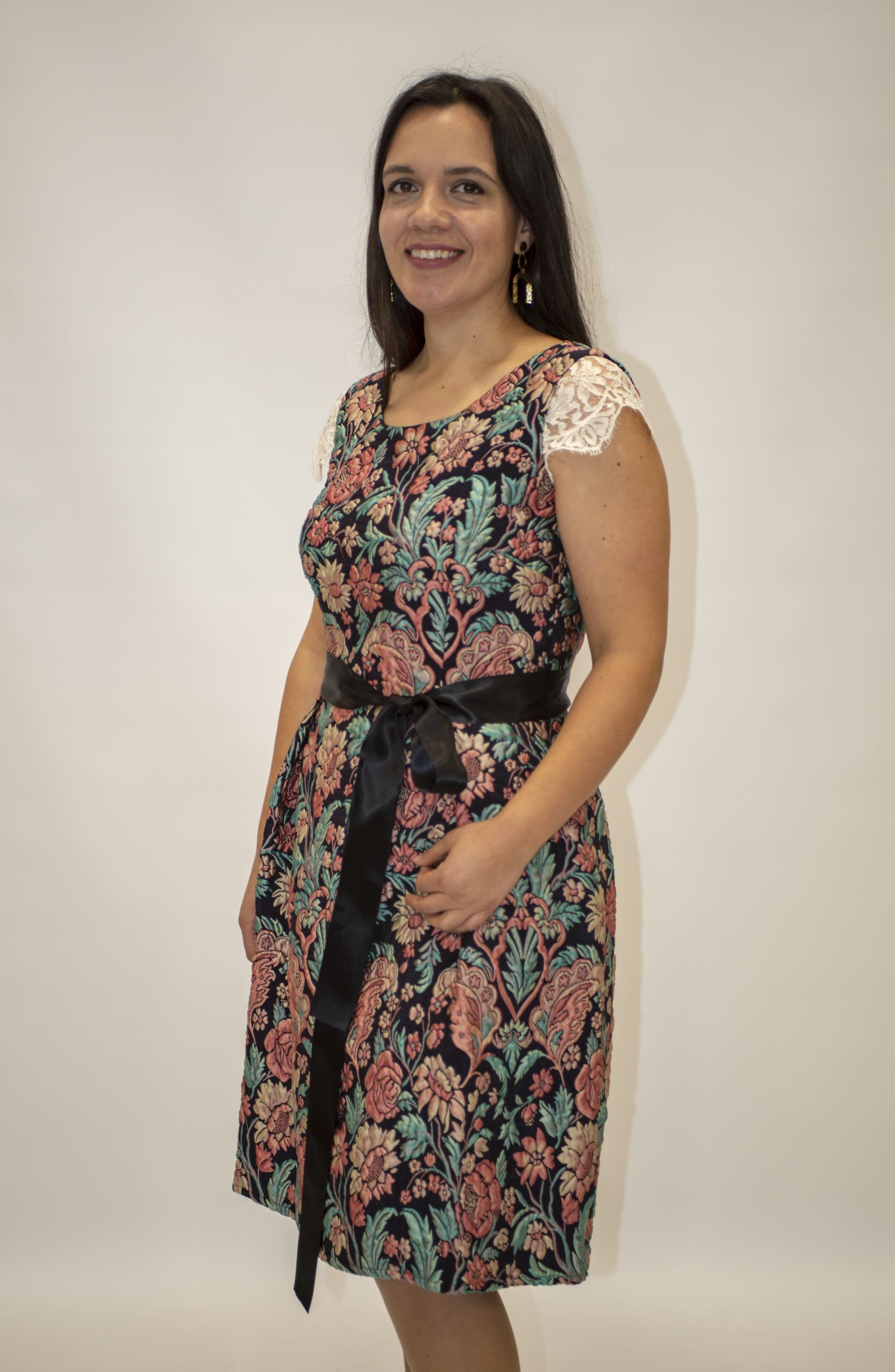 Este vestido de fiesta de Matilde Cano presenta un elegante estampado floral brocado en tonos pastel sobre fondo azul marino, que destaca por su sofisticación. Con escote redondo, manga sisa adornada con encaje y una espalda abierta con detalles dorados, aporta un toque clásico y sensual. La cintura se realza con una delicada lazada en azul marino, y el cierre con cremallera trasera asegura un ajuste perfecto. Una prenda ideal para ocasiones especiales que combina estilo, elegancia y comodidad.