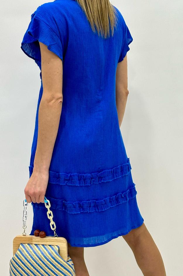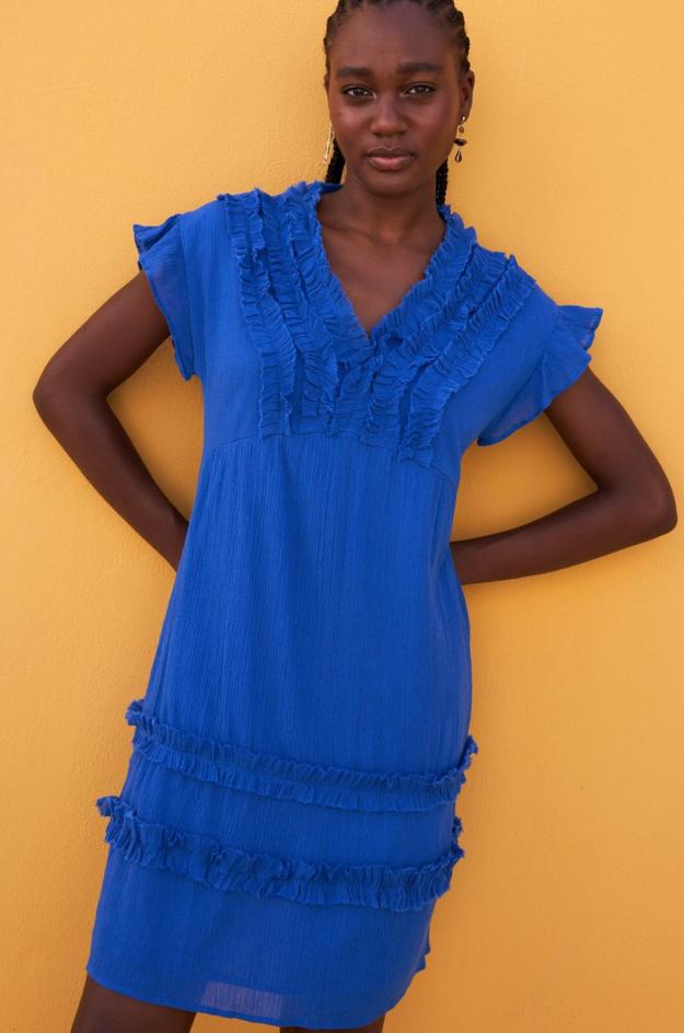 Vestido corto de la marca Md’M confeccionado en un tejido ligero y fluido, destaca por su vibrante tono azul eléctrico y sus delicados volantes que enmarcan el escote en pico y recorren el bajo de la prenda. Su diseño de manga corta y corte recto lo convierten en una opción cómoda y favorecedora para los días de calor.