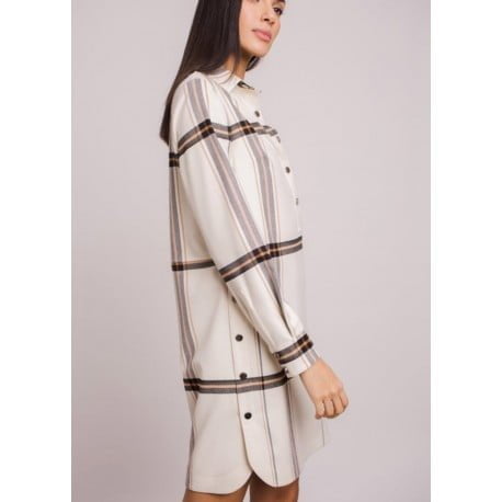 Vestido camisero de franela con cuello clásico con solapa de Alba Conde estampado de cuadros en color crudo . Corte holgado y escote cerrado con broches. Manga larga con puño.