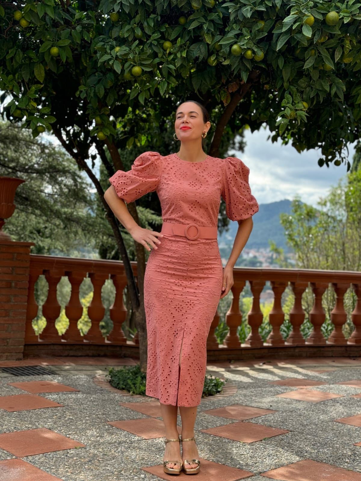 Precioso vestido de fiesta de Centella, confeccionado en un elegante brocado color rosa que aporta un toque de distinción y sofisticación. Su diseño destaca por un favorecedor escote redondo y mangas abullonadas por encima del codo, que realzan la feminidad del look. El corte entallado, complementado con un cinturón a juego, estiliza la silueta, mientras que la falda tubo con una sutil abertura en la parte delantera añade un toque de modernidad y comodidad al caminar. Cierre con cremallera en la parte trasera para un ajuste impecable. Ideal para eventos y celebraciones especiales.