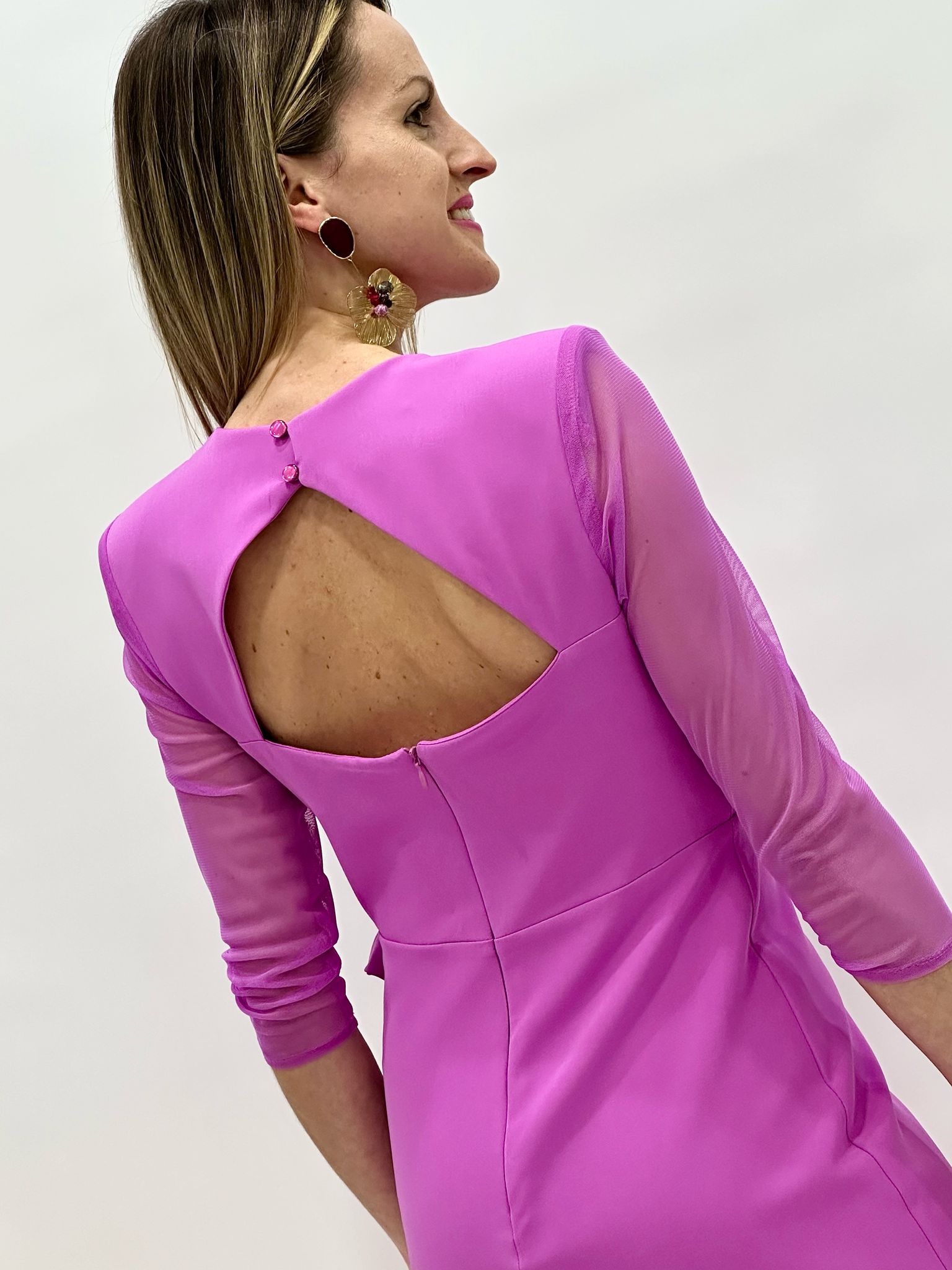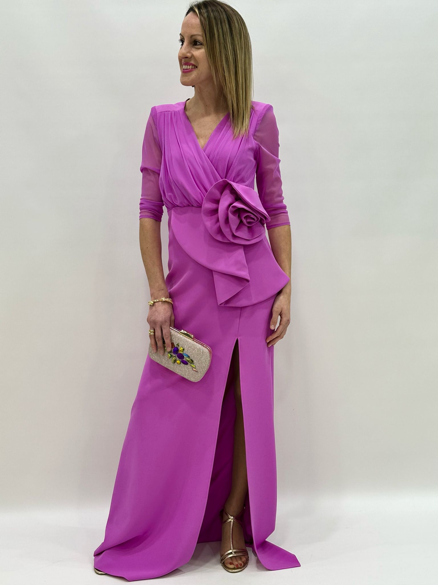 Este elegante vestido largo midi de Juan Marcos en un sofisticado tono morado es la opción perfecta para destacar en bodas, comuniones y eventos especiales. Su escote en pico y mangas tres cuartos de tull aportan un aire refinado y delicado. El corte en la cintura, realzado con una gran flor y un elegante volante, estiliza la figura y añade un toque único. La falda de corte recto, con abertura lateral, aporta movimiento y distinción. Completo con cierre de cremallera trasera, botón y abertura posterior, este diseño combina elegancia y sofisticación para una invitada impecable.