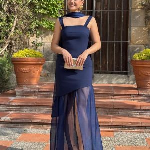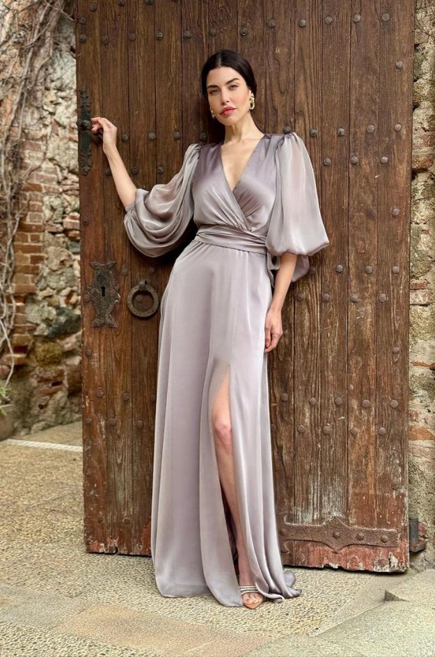 Vestido largo NEBLAK modelo CATI con diseño de mangas globo confeccionadas en gasa. Cierre lateral mediante cremallera oculta. Tejido principal en 97% poliéster y 3% elastán, que aporta estructura y elasticidad.