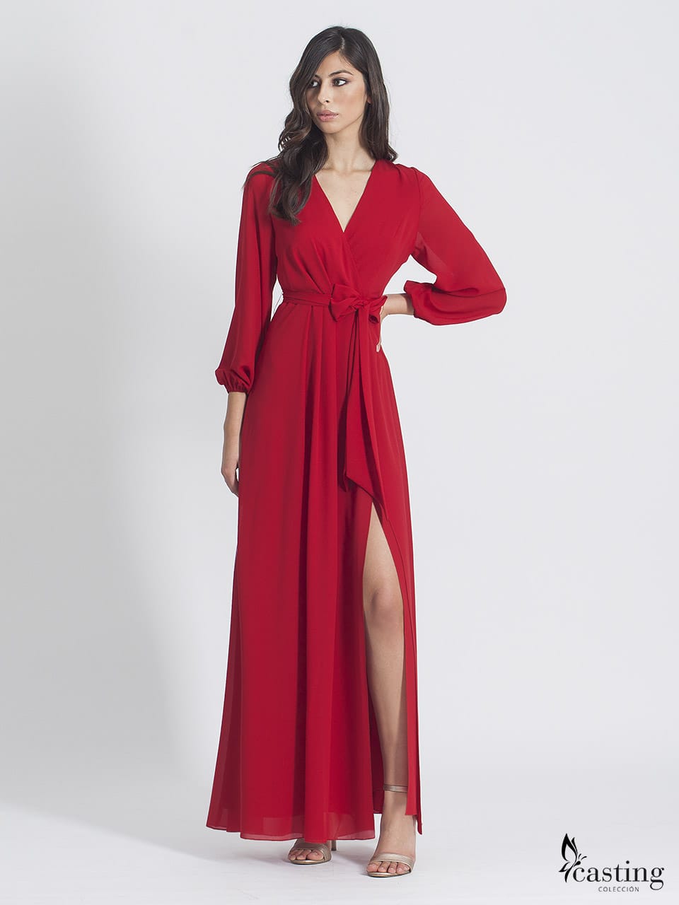 Vestido largo de fiesta de Casting  color rojo. Corte en la cintura y cinturón del mismo tejido. Escote pico con manga larga acabada en goma. Detalle de abertura elegante abertura en el lateral. Forro interior.