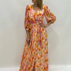 ¡Deslumbra en tu próximo evento con el vestido de fiesta estampado floral sobre fondo rosa de Centella! ¡Haz una entrada inolvidable con este elegante vestido!