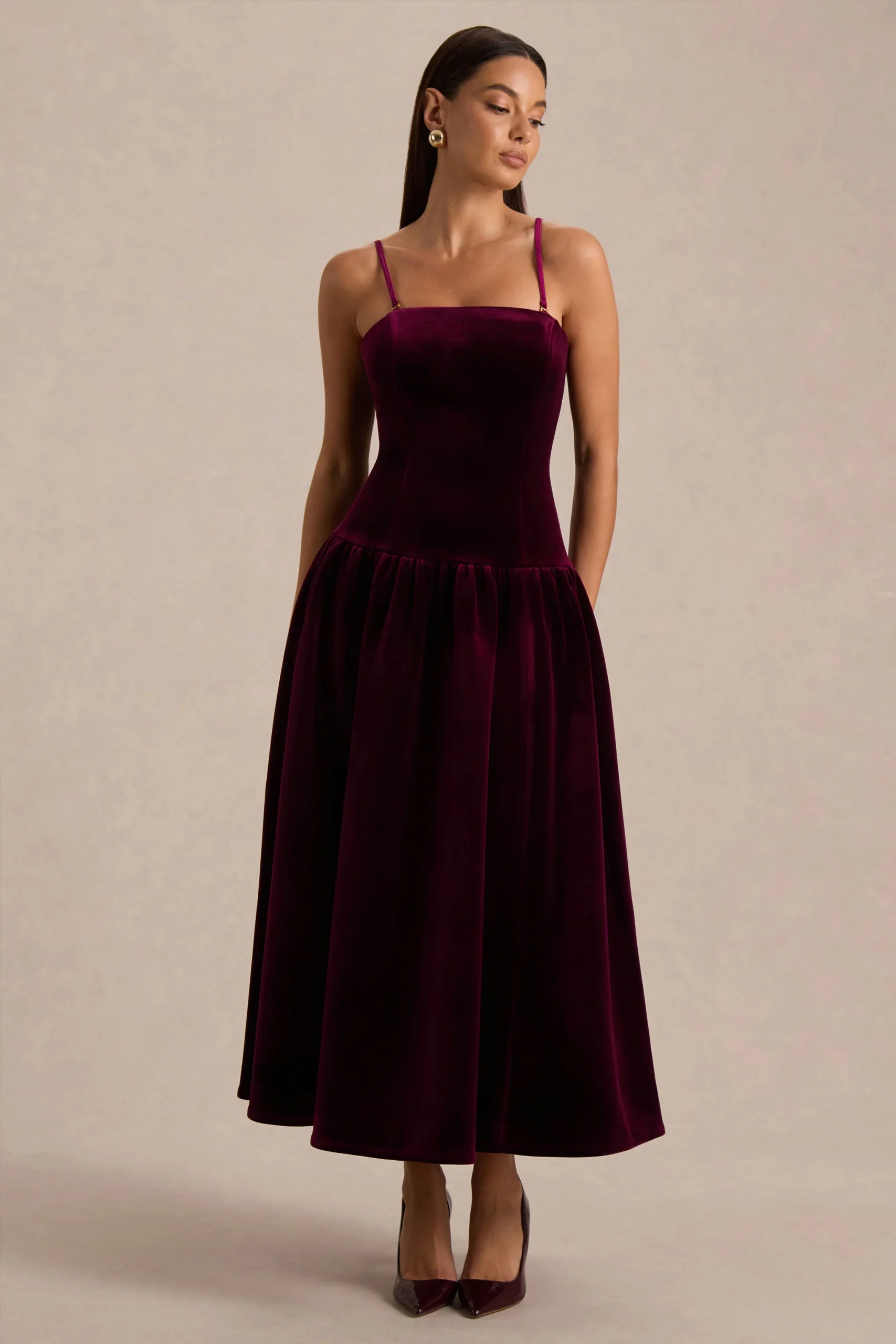 Dale la bienvenida a la elegancia atemporal con Violetta. Confeccionado en nuestro terciopelo premium en un profundo tono burdeos, esta pieza combina sutileza con presencia. Presenta un elegante escote bandeau y tirantes desmontables que enmarcan los hombros a la perfección, mientras que la silueta de cintura caída fluye hacia una falda fruncida que se mueve con gracia en cada paso. Violetta es un estilo que marca la diferencia, perfecto para veladas nocturnas y ocasiones especiales.