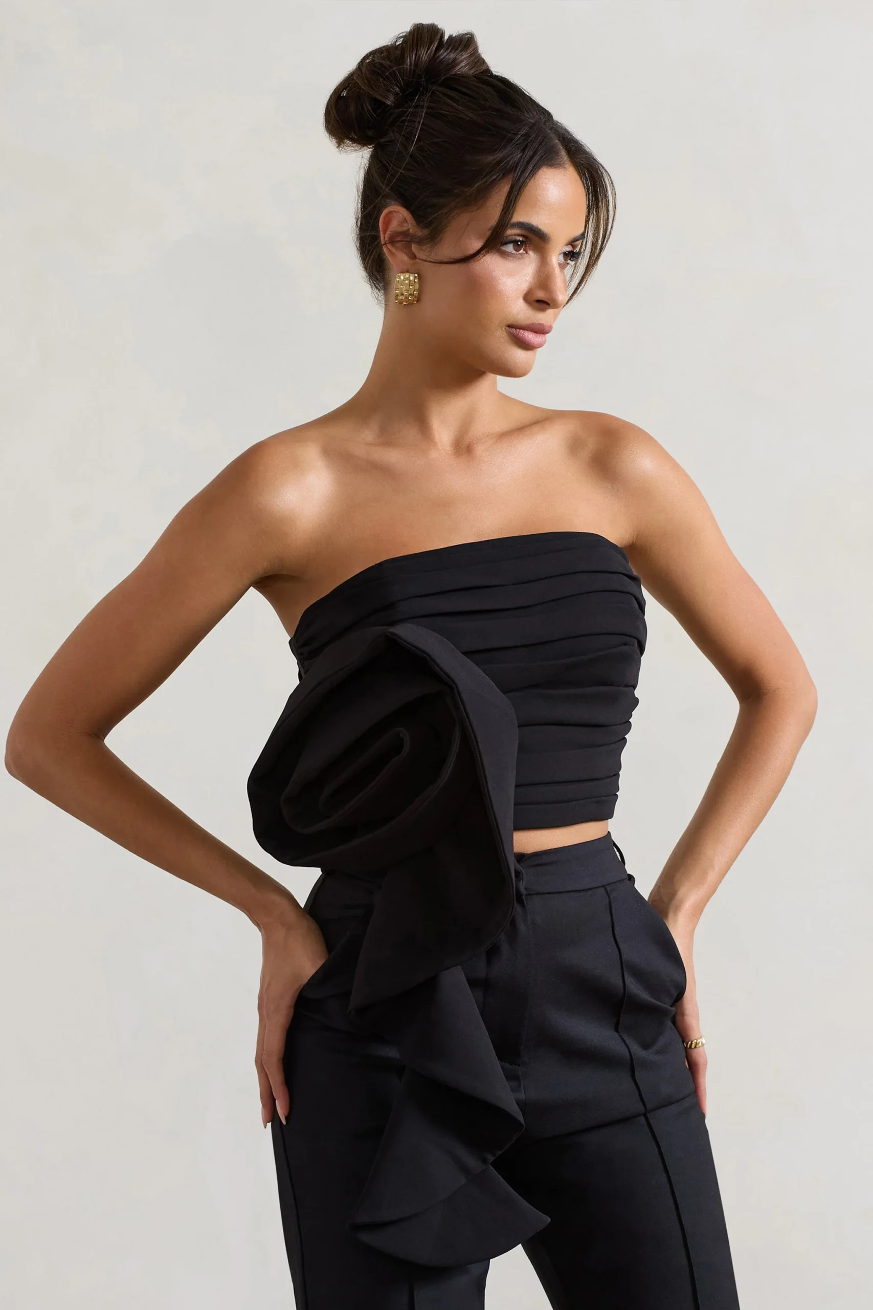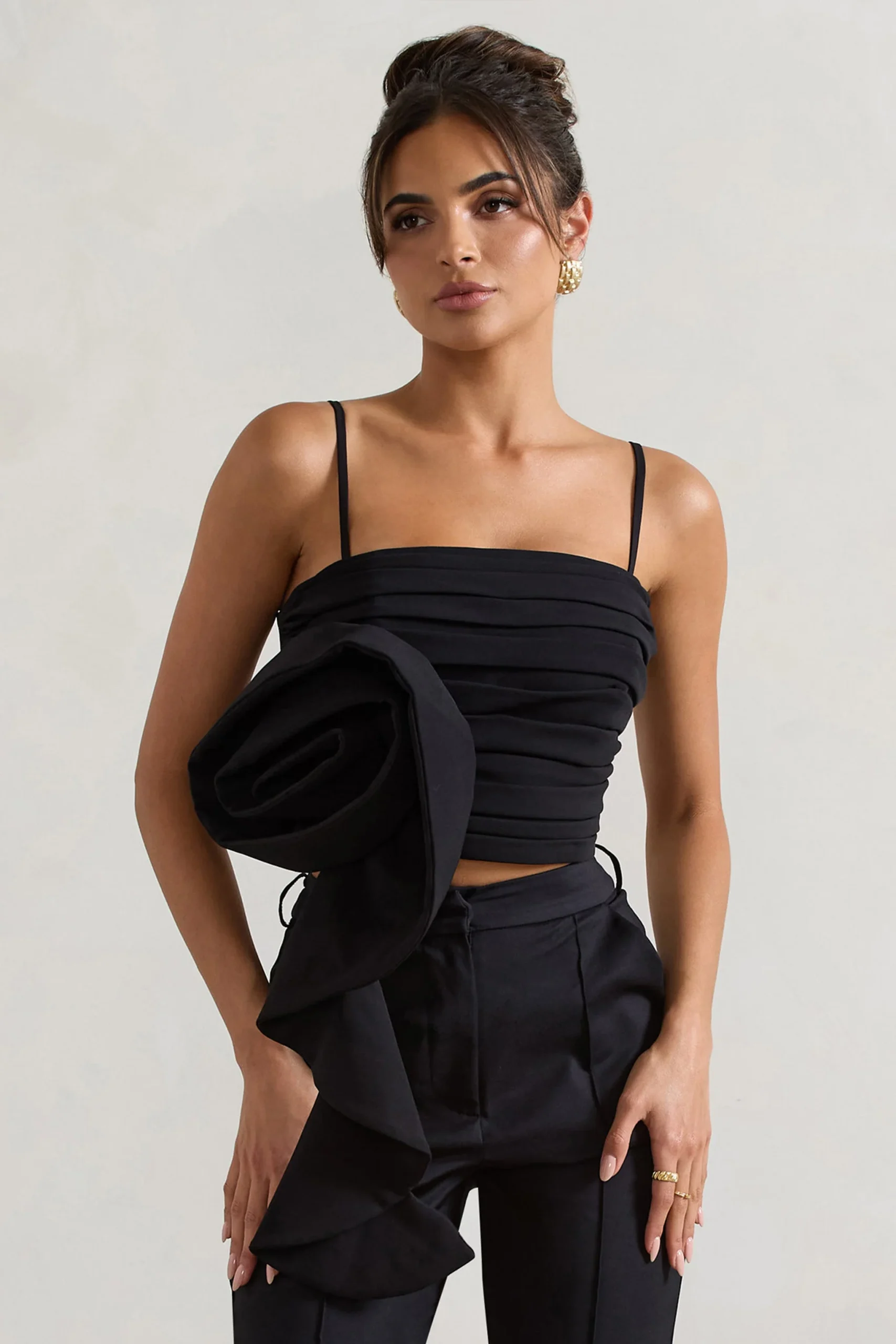 Dinos la ocasión, tenemos el top perfecto. Whirlwind ha sido cuidadosamente confeccionado en nuestro característico crepé elástico, con un favorecedor fruncido y tirantes desmontables para un acabado versátil. Completo con una corsage sobredimensionada colocada a lo largo de su lado, mantén este crop top negro al frente combinándolo con un moño elegante y algunos toques dorados.