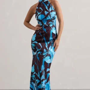 Adoria | Vestido maxi de satén con cuello alto y estampado floral