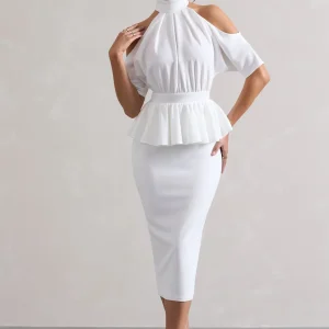 Yves | Vestido midi blanco con cuello alto y cintura peplum