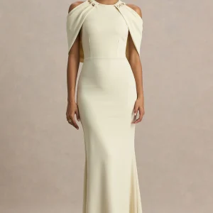 Yulia | Vestido largo blanco con capa plisada envolvente y detalles dorados
