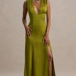 Ysabella | Vestido largo satinado verde Oliva con Escote Profundo y Abertura