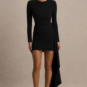 Zaya | Vestido Mini Negro de Manga Larga con Detalle Drapeado
