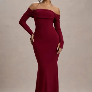 Amaia | Vestido Largo escote bardot de Manga Larga en burdeos